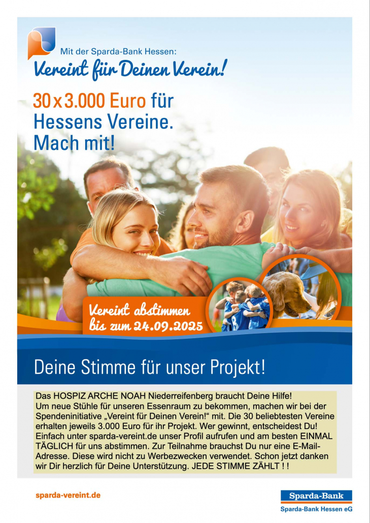 Wir würden uns sehr freuen, wenn es uns vereint gelänge, hierfür eine der 3.000-Euro-Spenden der Sparda-Bank Hessen zu gewinnen.
