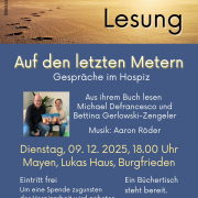 In einer Lesung am Dienstag, den 9. Dezember 2025 um 18.00 Uhr im Lukas Haus in Mayen, Burgfrieden, lassen die beiden Autoren das Publikum an ihren lebendigen Gesprächen und Begegnungen im Hospiz teilhaben.