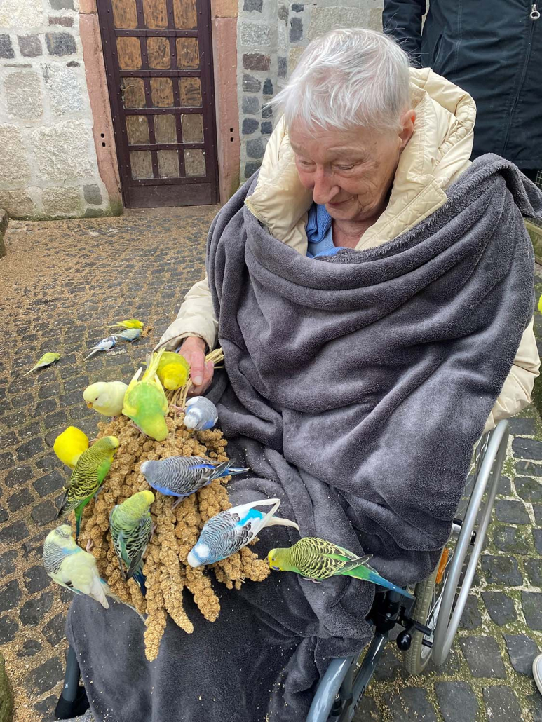 Obwohl die Vogelburg in Weilrod eigentlich bis zum 15. März in der Winterpause ist, wurde unserem Gast letzte Woche ein außergewöhnlicher Besuch ermöglicht. Eine Mitarbeiterin der Vogelburg führte sie exklusiv durch die Volieren der wunderschönen Papageien, Kakadus und Sittiche. Ohne andere Besucher – die ungeteilte Aufmerksamkeit der munteren und teilweise sehr zutraulichen Vögel – ein wirklich einzigartiges Erlebnis, das nicht nur unseren Gast sehr berührt hat.
